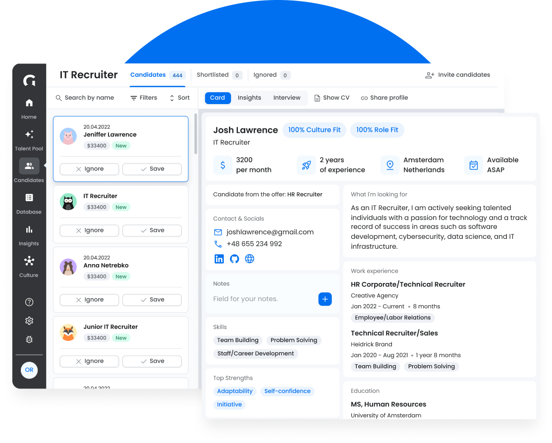 Filter your applicants by skills, past industries, salary, location. Sort applicants by culture fit specific to your needs, overall fit relevant to the role and to your needs.