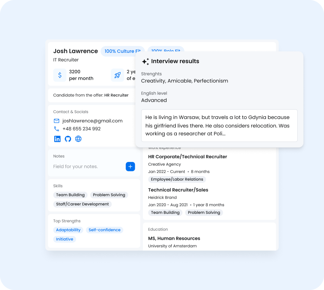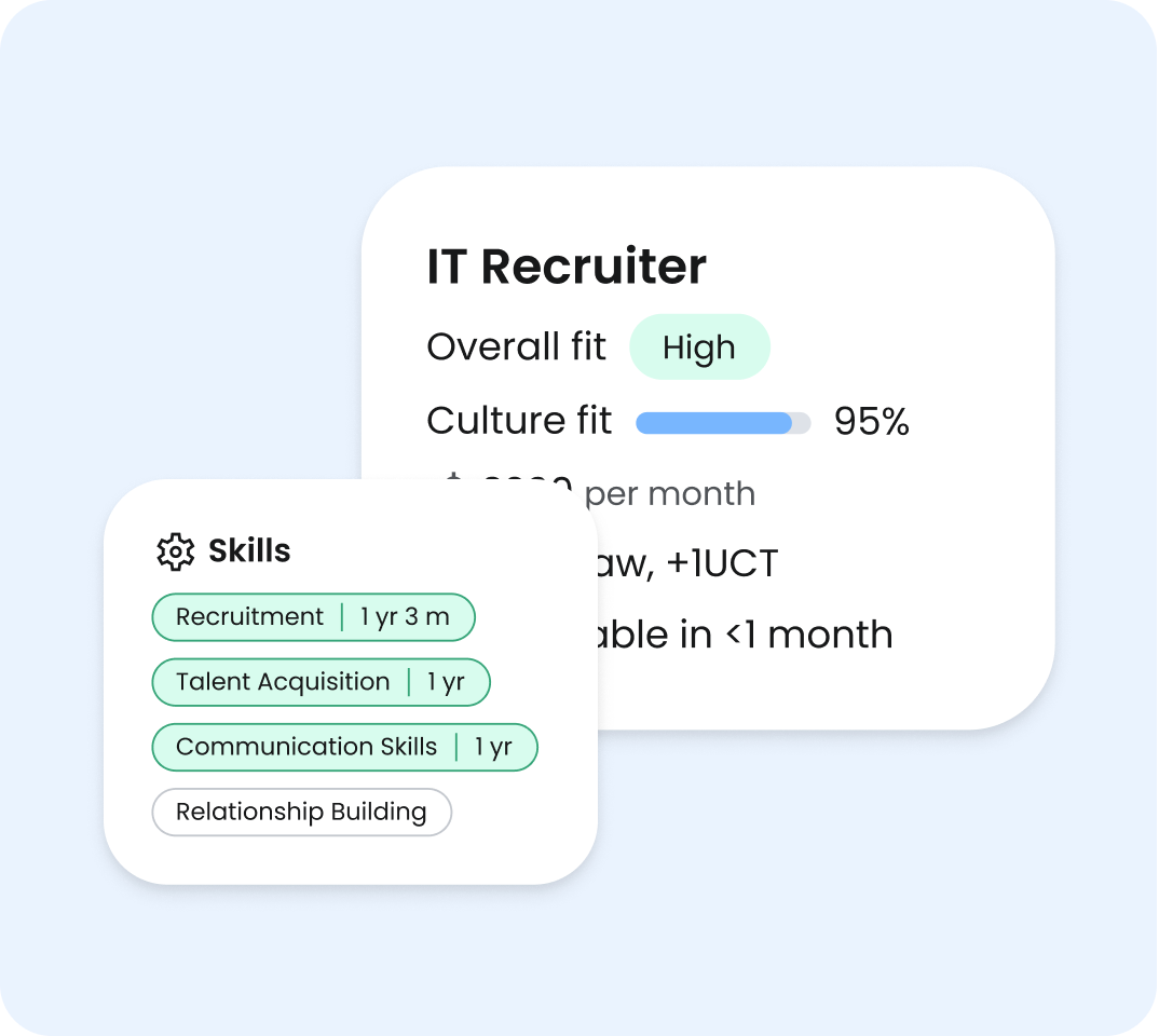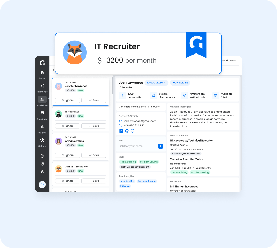 Filter by skills, salary, industry background, location, remote time-zone, language and work eligibility. Filtering is about speed and accuracy at the same time, so you waste less time talking to candidates that are not a fit due to your hard criteria or budget.