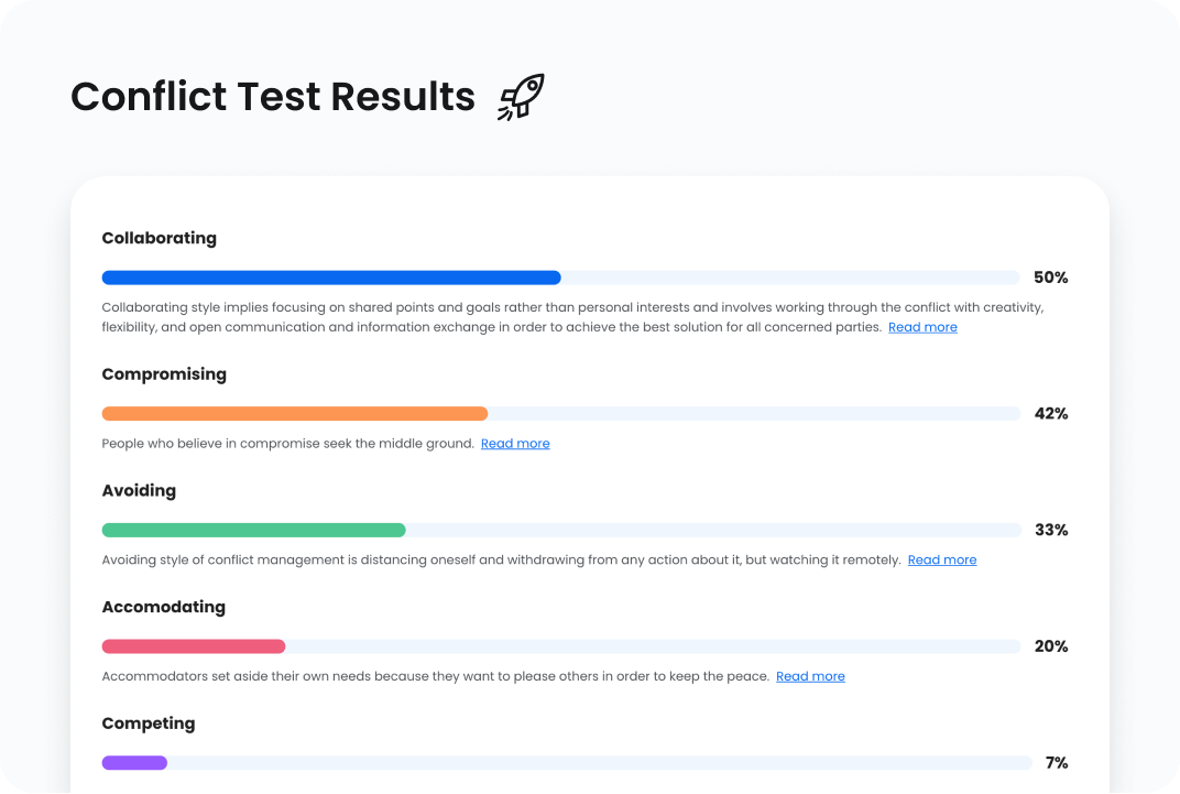 - Conflict resolution quiz: use our test to identify each person’s conflict resolution style. Then, have people share their results with the team and discuss how they can adapt their approach to work better with others.