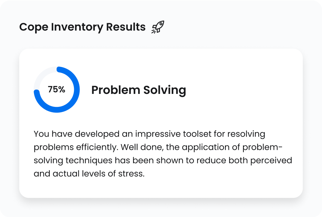 This is a stress resilience assessment. Our Cope inventory is a coping skills assessment that measures an individual's coping strategies and techniques in response to stress and difficult situations. It evaluates factors such as problem-solving, positive thinking, social support, and emotion-focused coping.