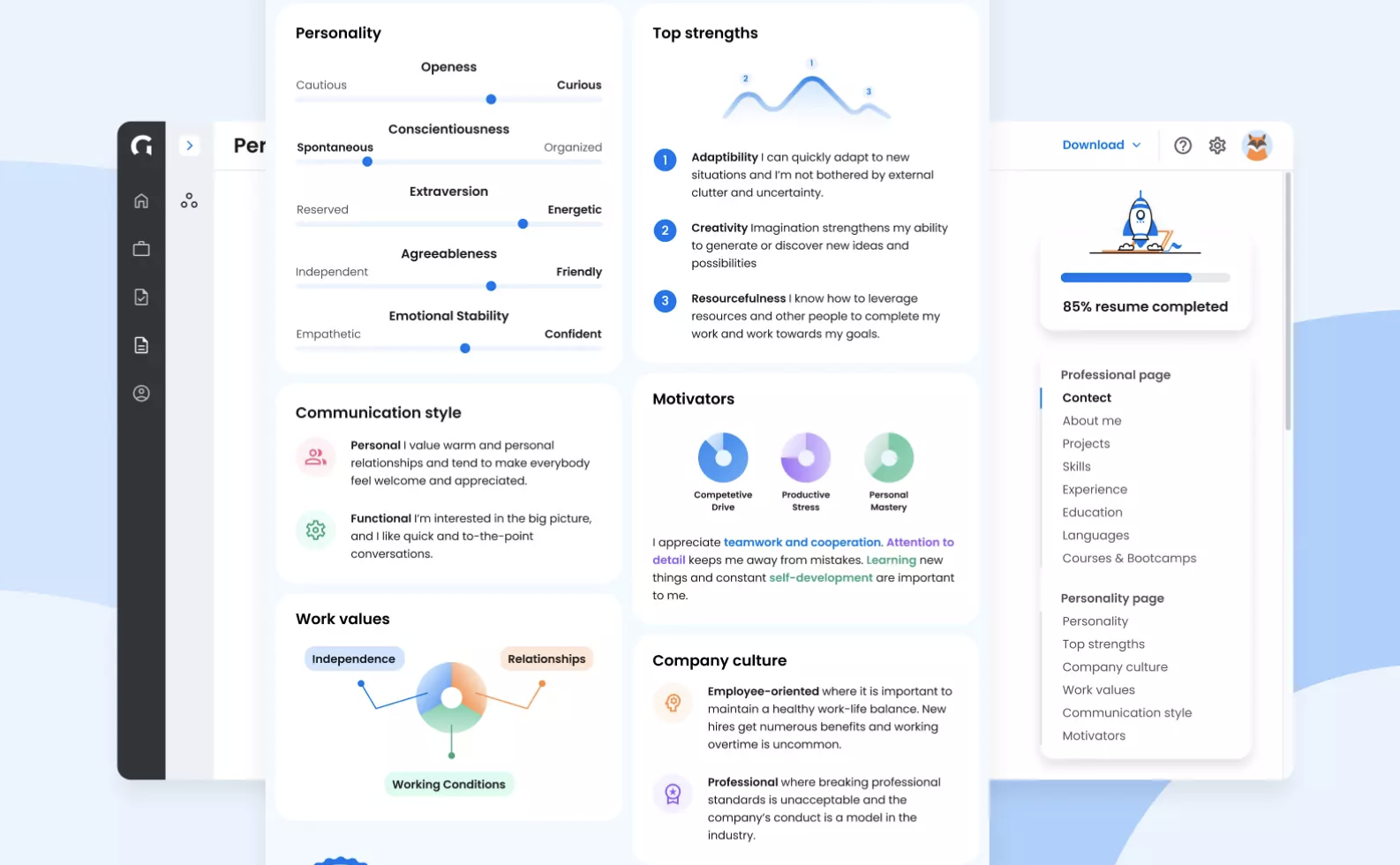 If you’re interested in tools that can help you flesh out your unique personality and character traits, your preferences and behavior styles, then you have two great options with Gyfted. One is to try our character and strengths assessments under the “Personal Growth” tab on Gyfted’s homepage, and the other easier option is to use Gyfted’s Personality Resume builder that helps you signal your unique soft skills and traits through a certified personality resume.