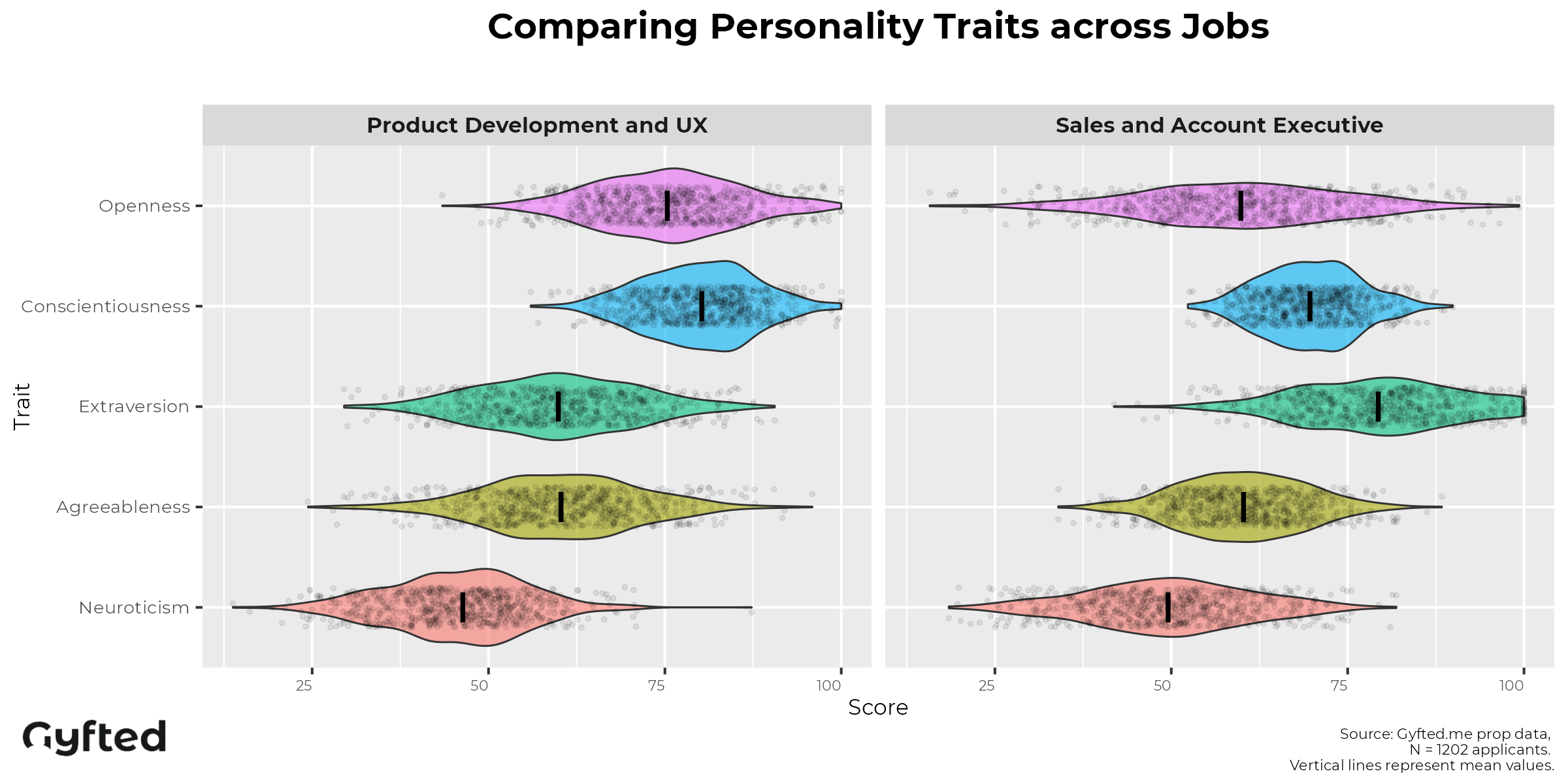 The data presented is based on a study conducted by Gyfted.me, involving 1,202 applicants across Sales & Account Executive roles and Product Development & UX roles. The study measured five key personality traits: Openness, Conscientiousness, Extraversion, Agreeableness, and Neuroticism – based on the OCEAN / Five Factor model.